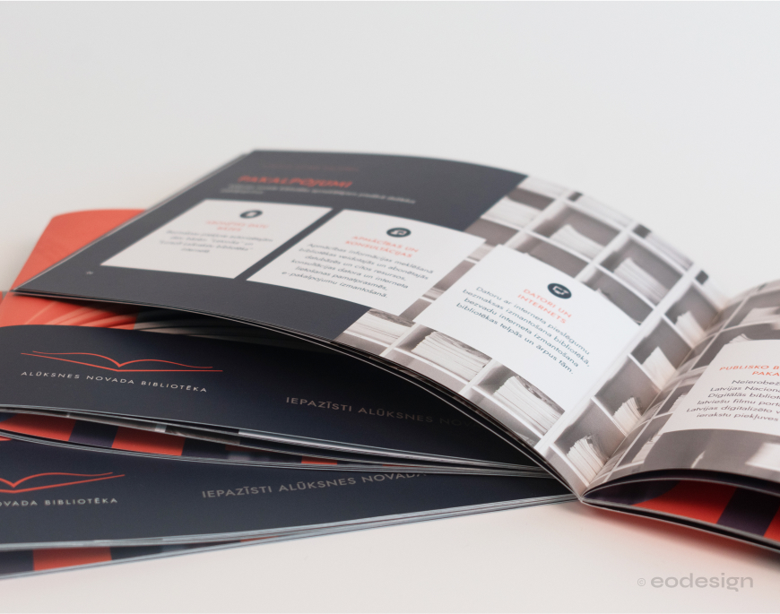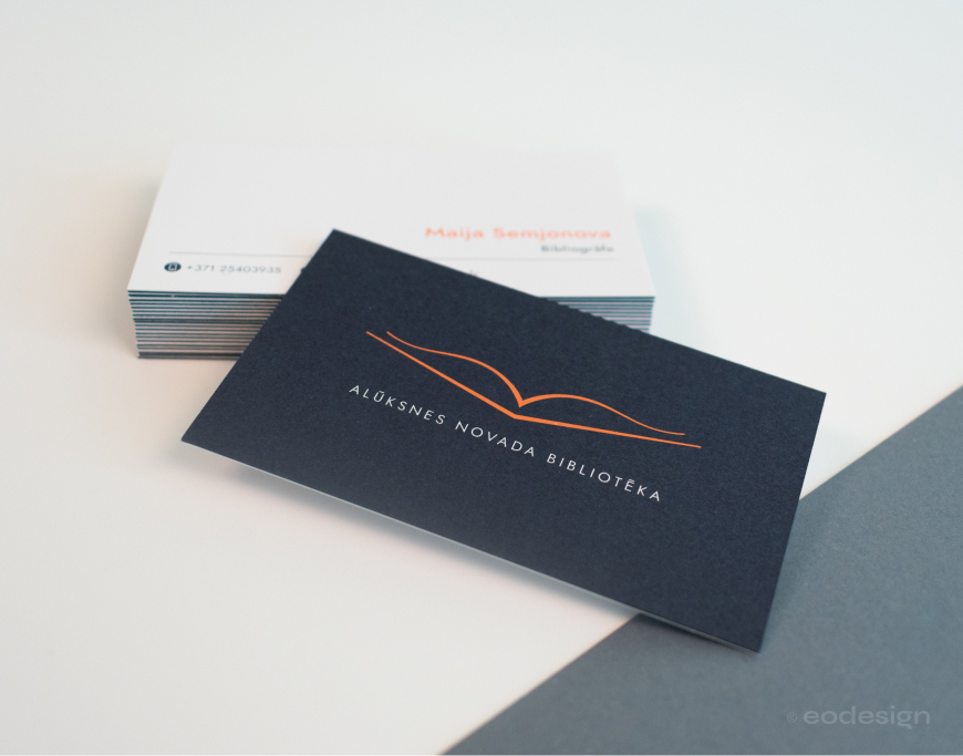 Alūksnes novada bibliotēkas vizuālās identitātes ietvaros izstrādāts dizains darbinieku vizītkartēm, bibliotēkas pakalpojumu lietotāju kartēm, dokumentu mapēm un veidlapām un aploksnēm.
