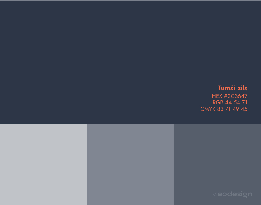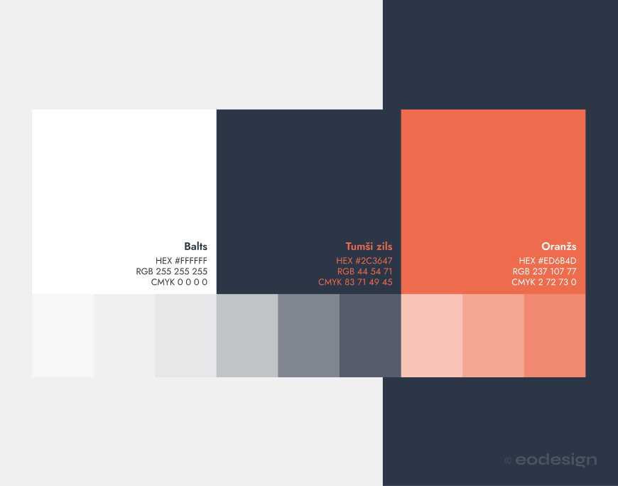 Tumši zilā un baltā krāsa kalpo kā pamata krāsas, radot stabilu un profesionālu tēlu, savukārt oranžā izmantota akcentiem – virsrakstos un grafiskos elementos – piešķirot tēlam dzīvīgumu un enerģiju.