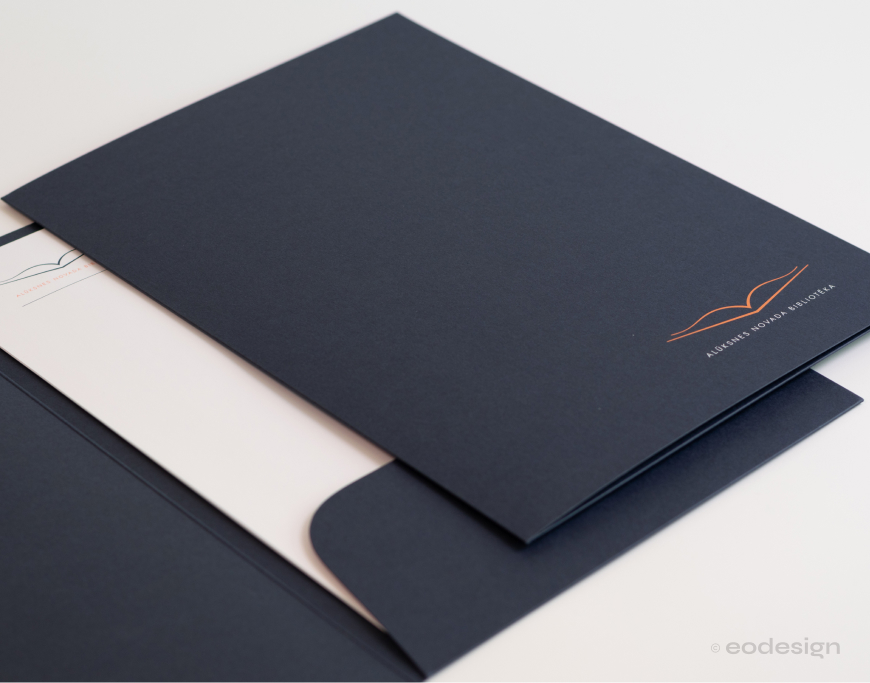 Veidlapas un mapes; Veidlapu augšdaļā – logotips un smalka, tumši zila līnija. Arī uz mapēm izvietots logotips. Mapju izmērs: 220 × 360 mm.